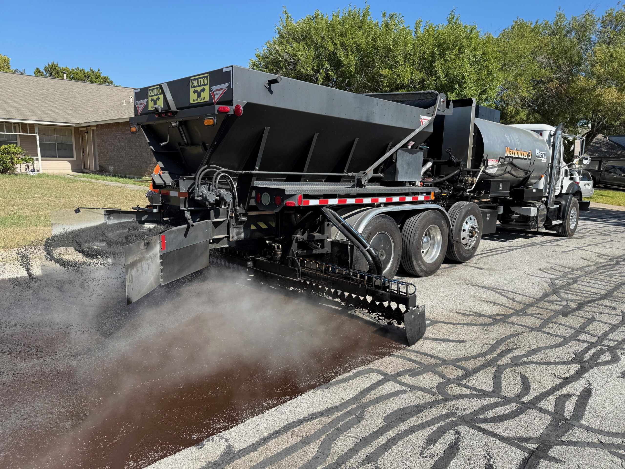The combined product is then applied to the open grade asphalt pavement, with a uniquely engineered “Combo” applicator truck providing a single “one pass” surface seal treatment to the pavement. There is no requirement for rolling or sweeping the pavement, post application, and Return to Traffic occurs within 2-3 hours normally, dependent on climate conditions.