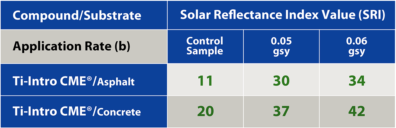 PlusTi™ A.R.A.-1 Ti® asphalt rejuvenator / sealer combines Maltene Replacement Technology (MRT) to revitalize and seal aging asphalt with Photo Catalytic Technology (PCT) that removes nitrogen oxides (NOx), volatile organic compounds (VOC), and other airborne vehicular exhaust pollutants. The solar-reflective top surface reduces heat absorption and related radiative forcing (RF) by materially reducing the convective re-release of UV radiation that would otherwise contribute to the heat island effect common in our urban centers. The chemistry also slows down pavement oxidation, thereby further extending the service life of treated surfaces.